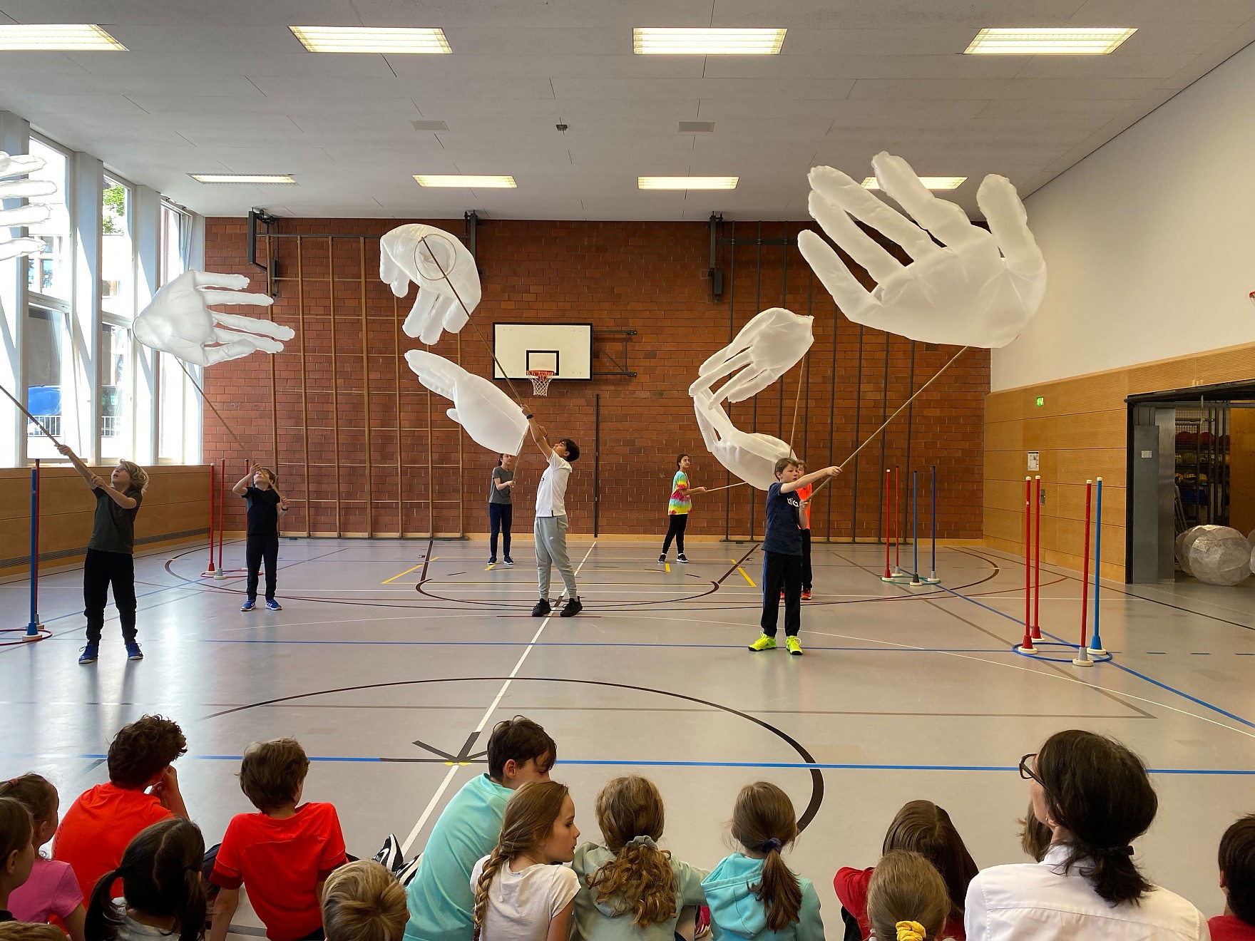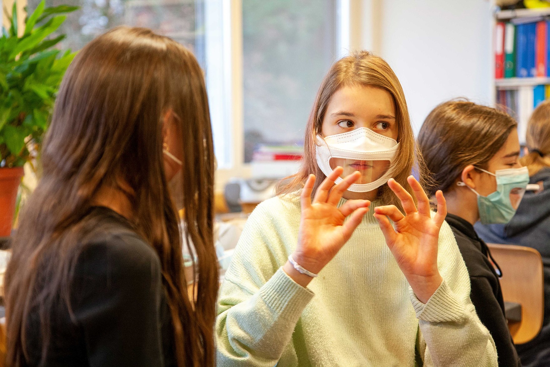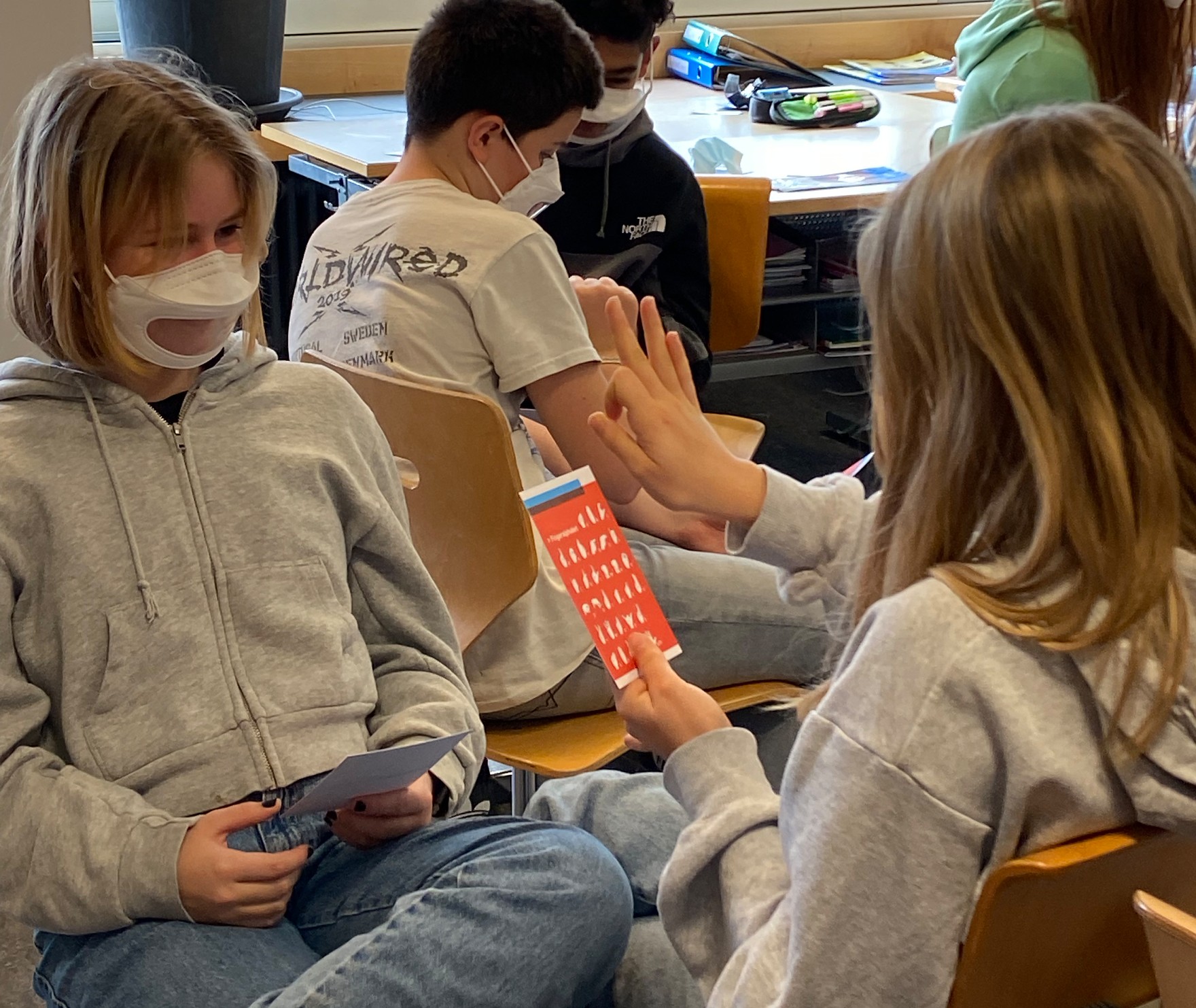 Since January, the pupils have been learning the basics of sign language in the educational art project «Gib mir die Hand». Yasemin Özdemir, sign language specialist, has been practising diligently with them - today Andrin Siebenhaar, himself deaf, visited us and communicated with the pupils in signs!